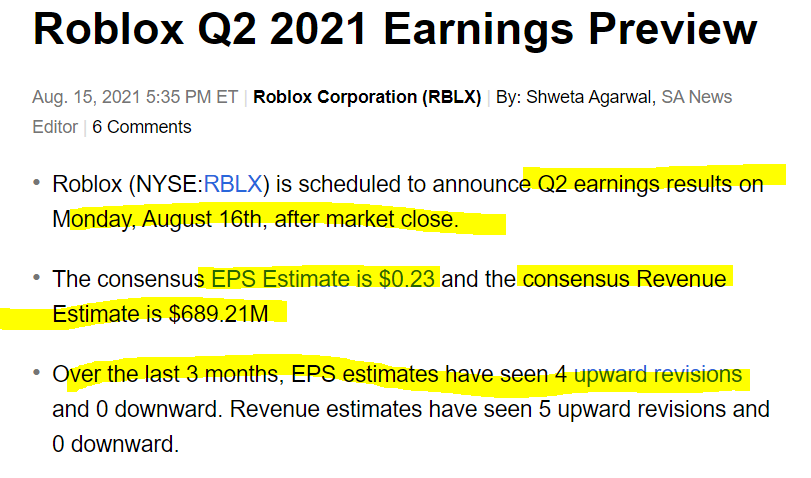 로블록스 (RBLX) 2Q Earnings preview 실적발표 예상 전망치