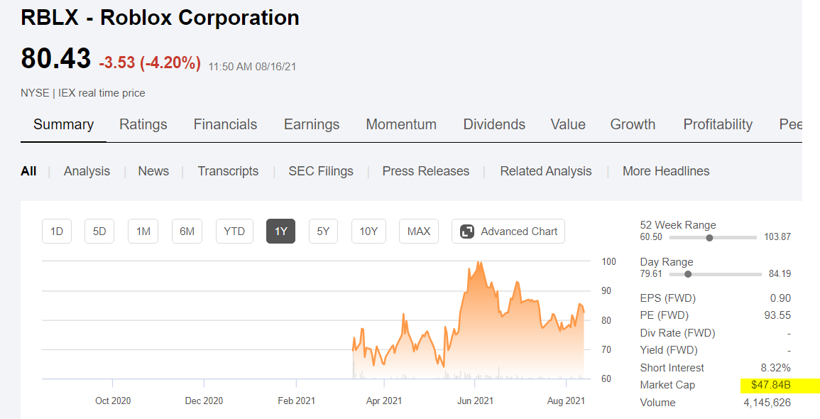그 중에서도 일명 메타버스 대장주라 불리는 로블록스 (티커, RBLX)의 실적발표 예상치가 나오면서